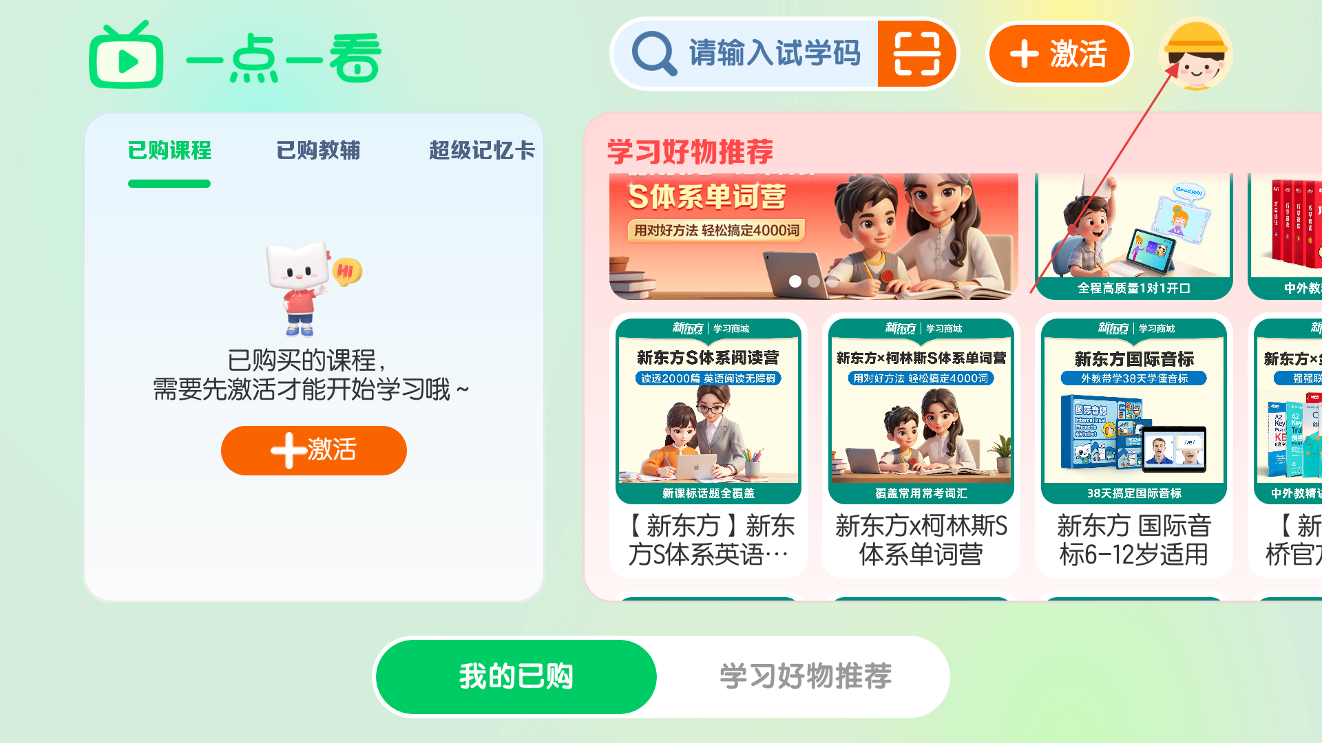 2、进入【一点一看】后,在【我的已购】页面找到已购课程,点击头像按钮解锁课程学习权限,进入个人页面。