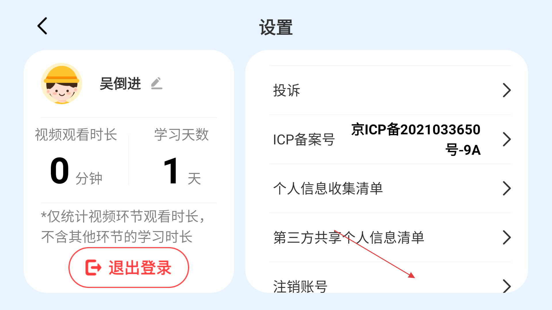 3、进入【设置】页面,可查看学习数据,也能找到【注销账号】选项,按提示操作可发起账号注销流程。