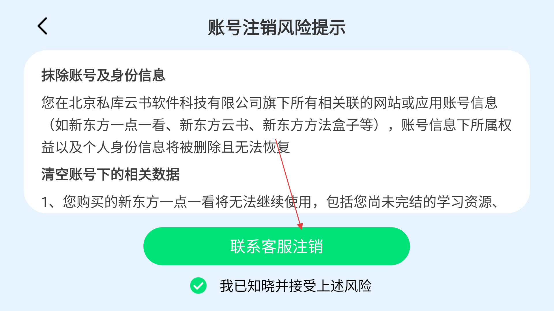 4、进行账号注销时,需确认【账号注销风险提示】内容并勾选同意,点击【联系客服注销】完成后续操作。