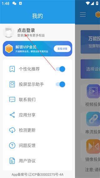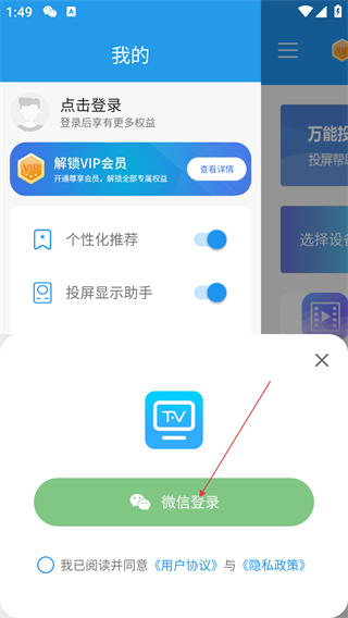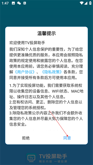 1、打开TV投屏助手,阅读并确认《用户协议》《隐私政策》,点击【同意】按钮进入应用。