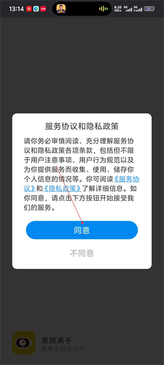 1、首次使用【录屏高手】,需点击弹窗中的【同意】按钮,确认服务协议与隐私政策,方可进入应用主界面。