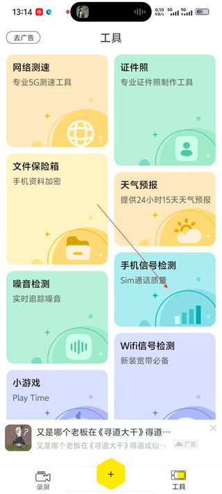 3、在工具页面中,点击【手机信号检测】选项,可进入信号检测页面,实时显示当前手机信号的强度(单位:dBm)及状态评级。