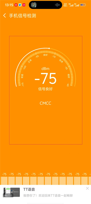 4、手机信号检测页面会以数值(如-75dBm)和文字(“信号良好”)呈现信号状态,同时显示当前运营商标识(如“CMCC”)。