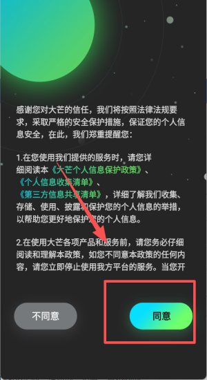 1、点击“同意”按钮,同意应用的隐私政策和服务条款。