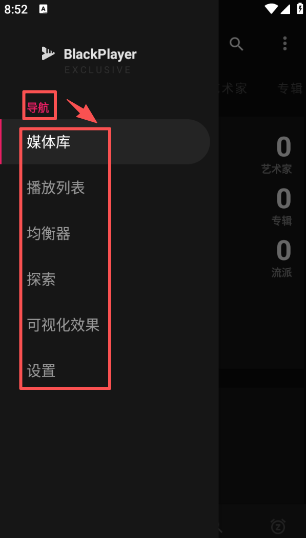 1、进入媒体库页面,点击左上角菜单按钮,展开导航列表,可选择播放列表、均衡器等功能。
