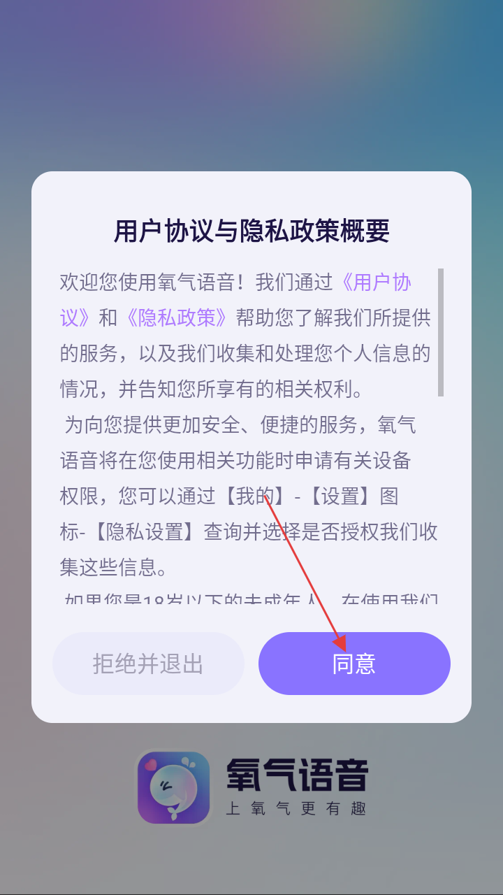 1、首次使用氧气语音,会弹出【用户协议与隐私政策概要】窗口,仔细阅读后,点击【同意】,进入登录相关页面。