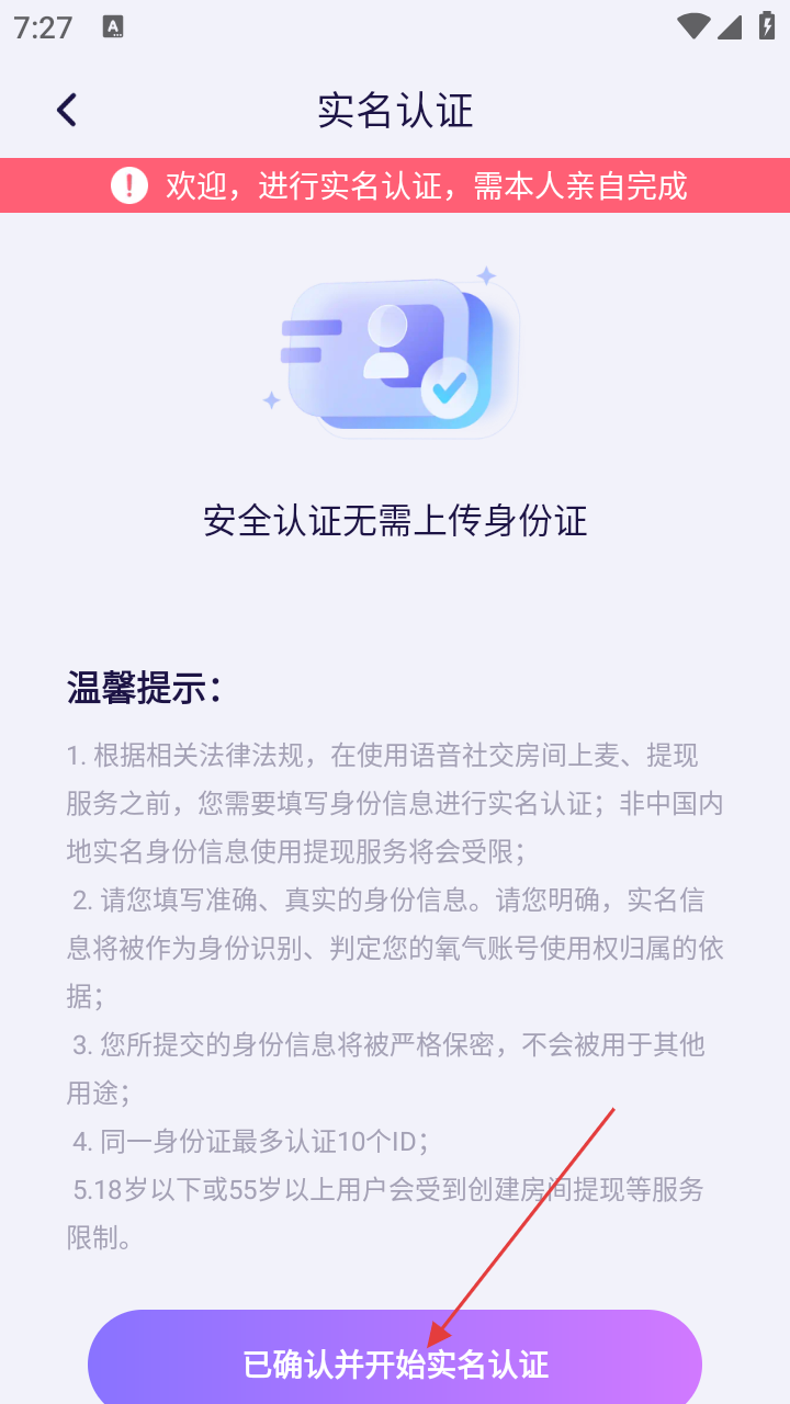 4、在实名认证页面,若确认要开始实名认证,点击【已确认并开始实名认证】按钮,进行实名认证操作。