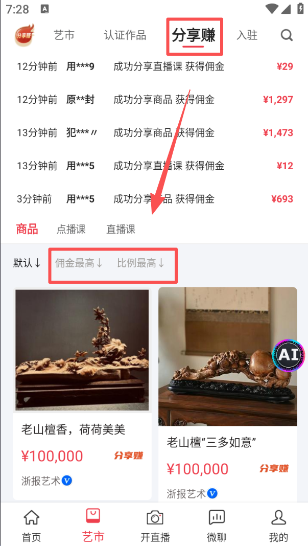 3、在 “分享赚” 板块,通过 “佣金最高” 等筛选条件,挑选作品进行分享,可获取对应的佣金奖励。