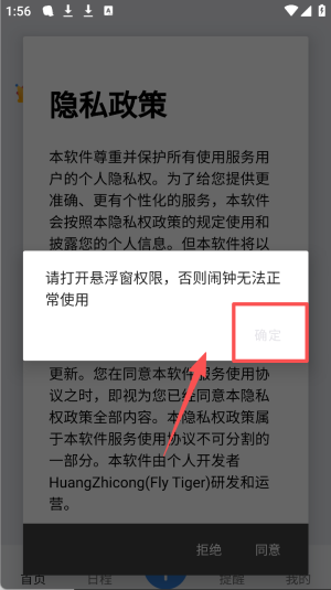 1、点击“确定”按钮,同意隐私政策并允许悬浮窗权限。