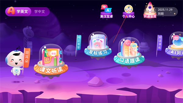 1、在【学英文】界面,可选择【课文听读】【音标练习】等功能,点击【个人中心】使用对应服务。