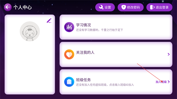2、进入【个人中心】,可查看【学习情况】,还能通过【班级任务】模块的【加入班级】按钮,输入班级ID加入虚拟班级。