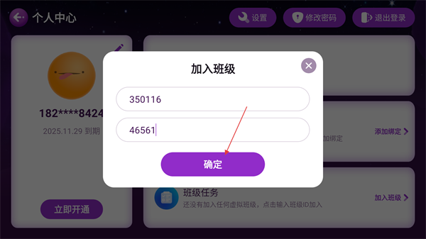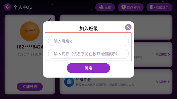 4、在【加入班级】弹窗内填好班级ID与昵称后,点击【确定】按钮,即可完成班级加入流程,关联对应学习班级。