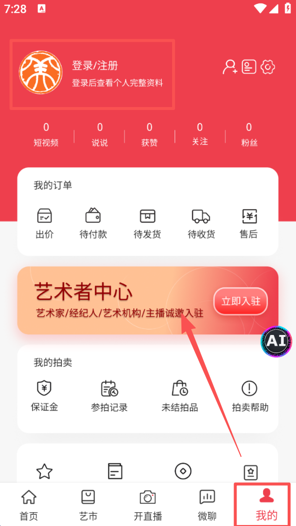 4、打开 “我的” 页面,点击 “艺术者中心” 旁的 “立即入驻”,可申请成为平台的艺术创作者或机构。