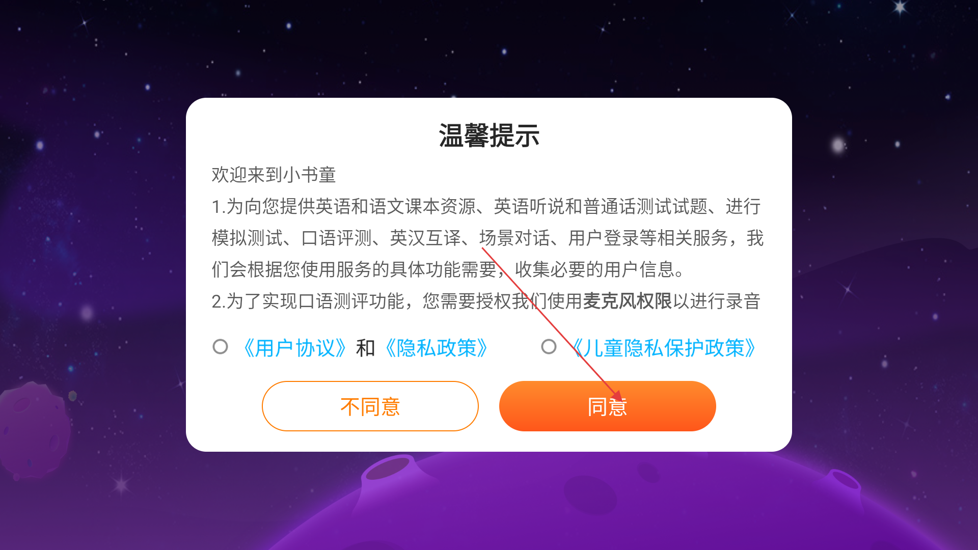 1、进入【小书童】前,需选择对应协议并点击【同意】,同时授权麦克风权限以支持口语测评功能。