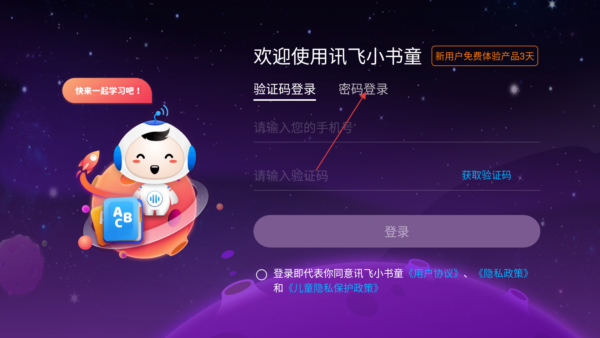 2、进入【讯飞小书童】登录页,新用户可享3天免费体验,登录方式可选【验证码登录】或【密码登录】。