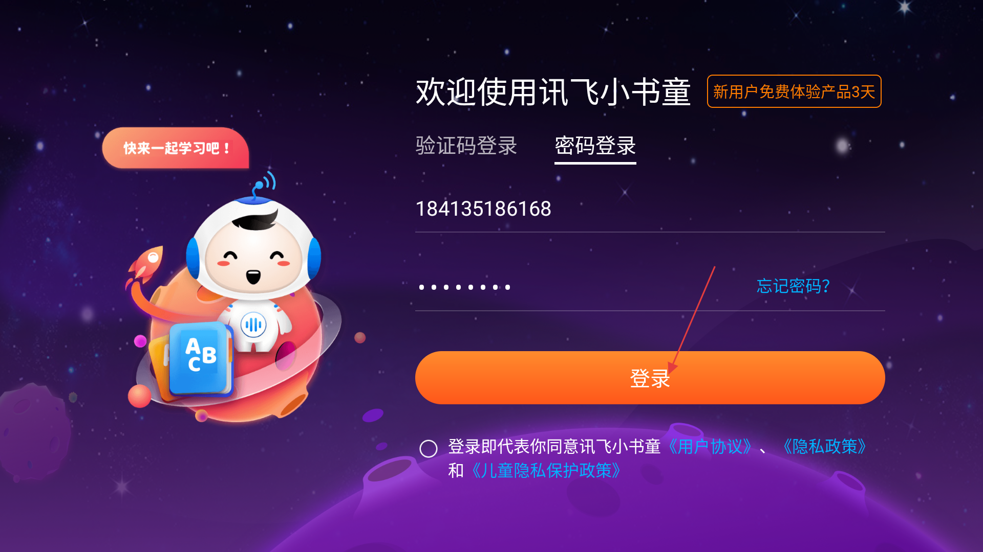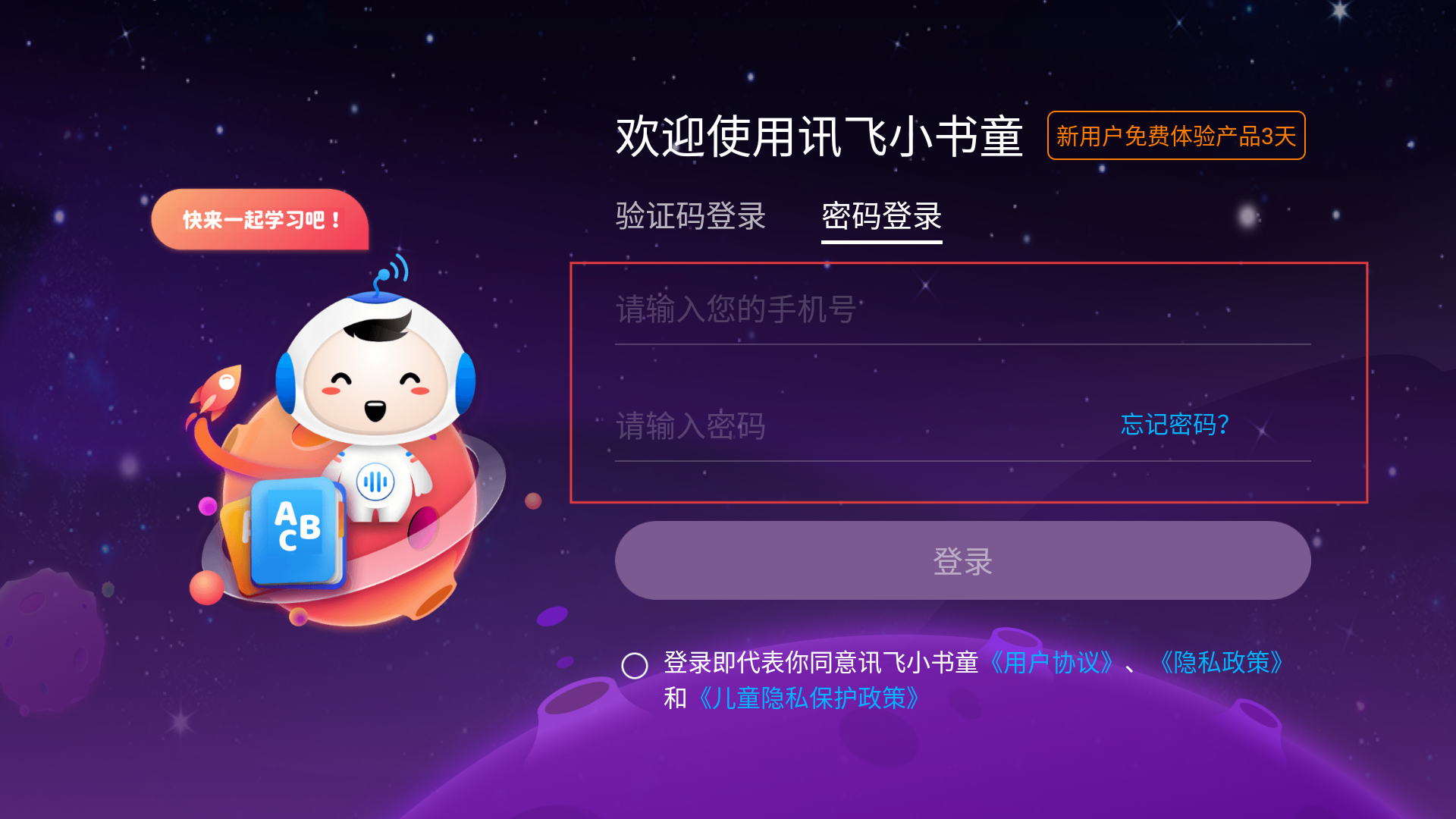 4、在【密码登录】界面填写手机号与密码后,勾选协议即可点击【登录】按钮进入【讯飞小书童】。