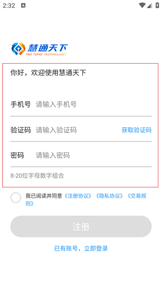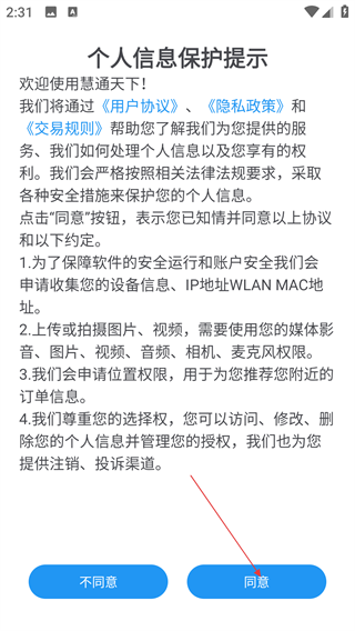 1、首次打开“慧通天下”App,阅读《个人信息保护提示》,点击【同意】授权相关协议与权限,进入登录界面。