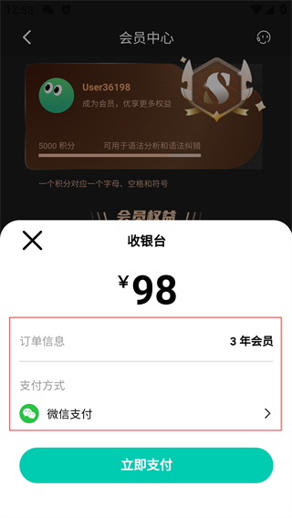 4、在收银台界面,确认订单信息(3年会员)与支付方式(微信支付),点击【立即支付】完成购买。