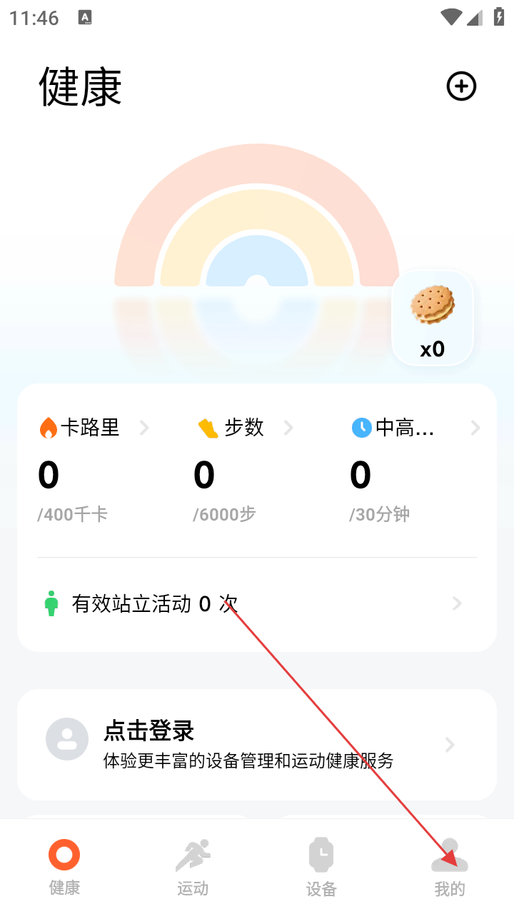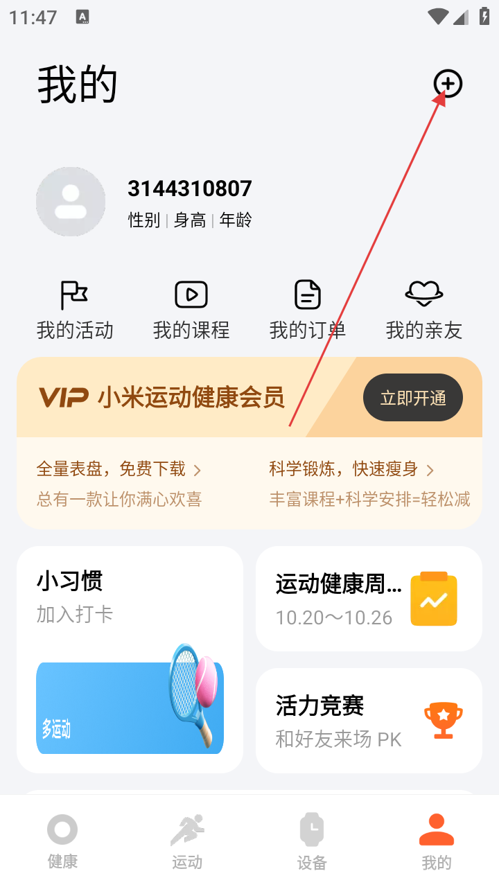 2、进入【我的】界面后,点击右上角【+】按钮,可进入添加设备流程,以便连接运动健康设备。
