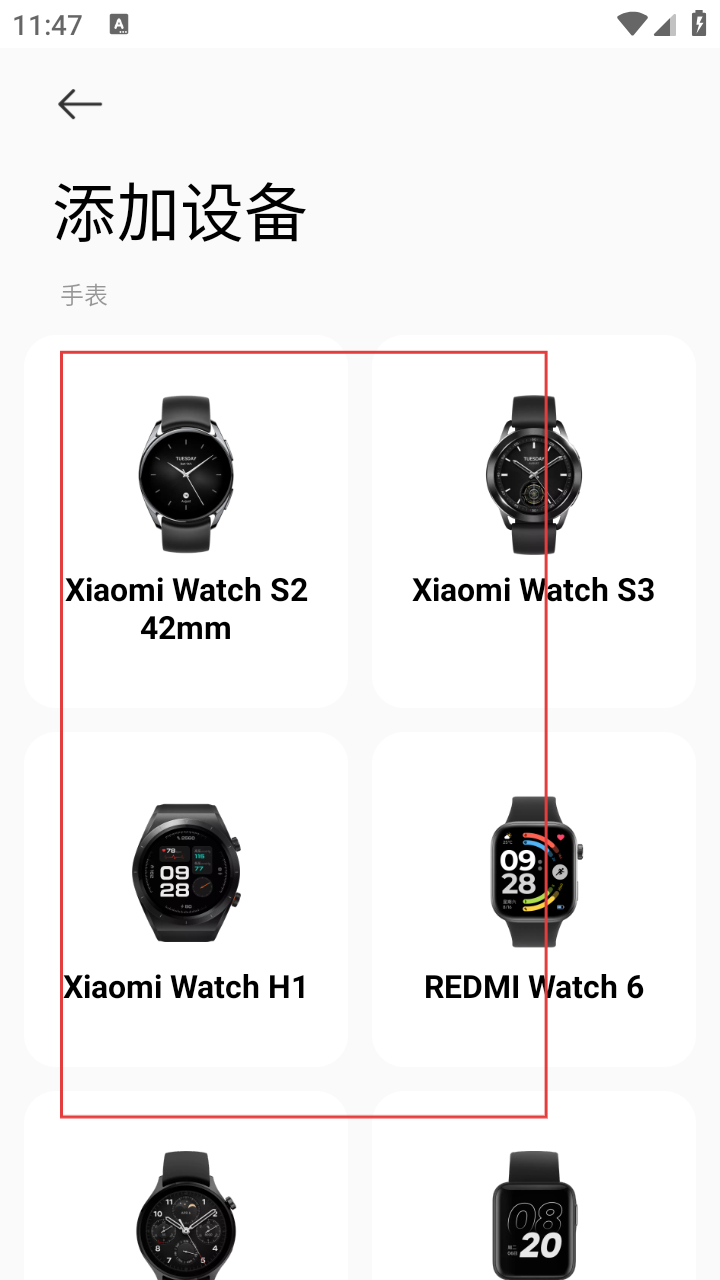 4、按型号添加设备时,可在列表中选择对应设备,如【Xiaomi-Watch-S2-42mm】【Xiaomi-Watch-S3】等,完成设备添加操作。