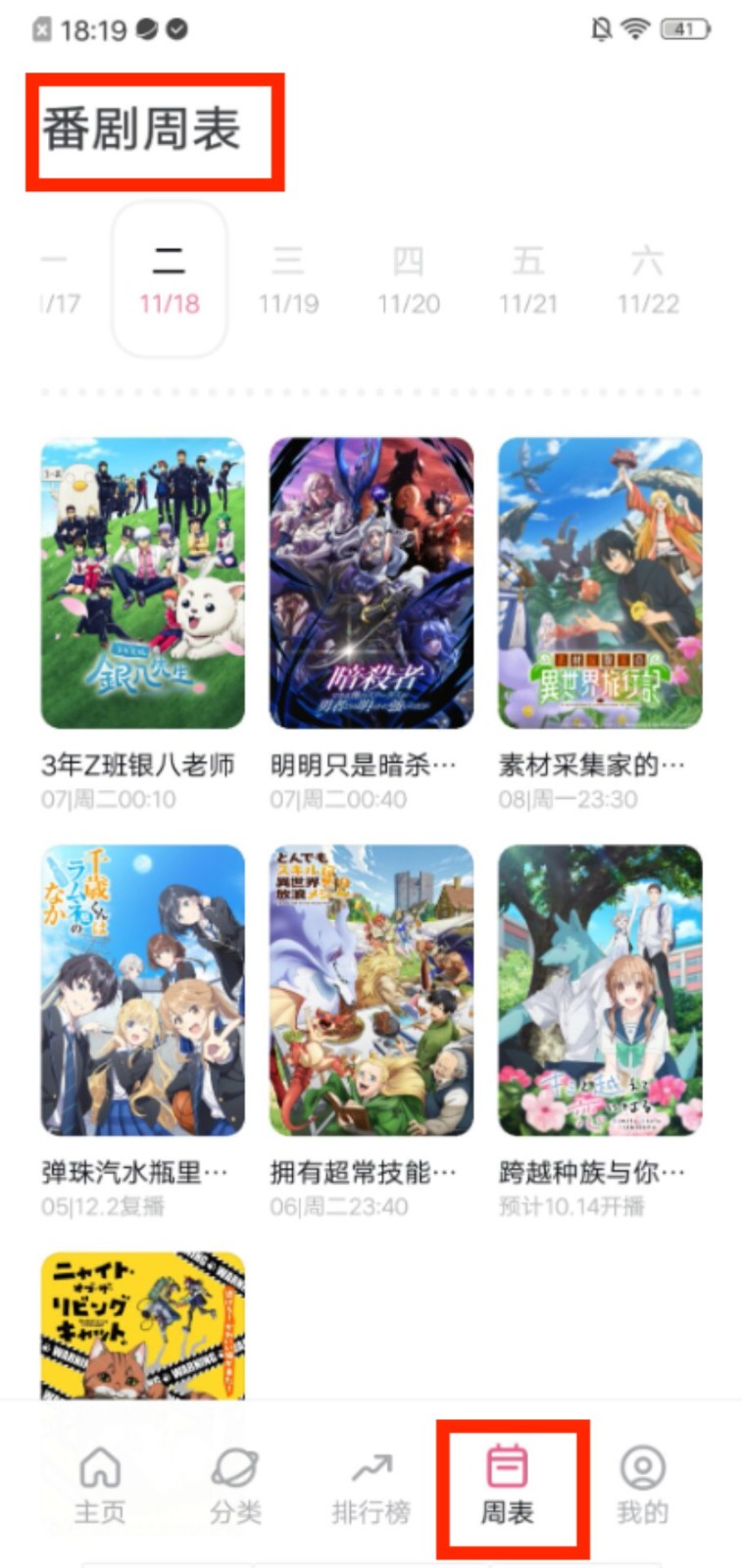4、点击 “周表” 进入番剧周表页面,按日期查看对应时段更新的动漫,合理安排观看时间。