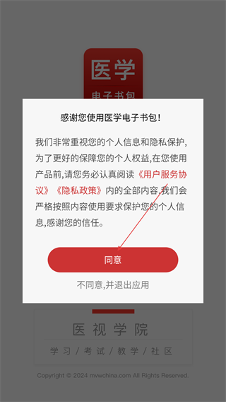 1、首次打开【医学电子书包】应用,需阅读《用户服务协议》《隐私政策》,点击【同意】按钮以进入应用。