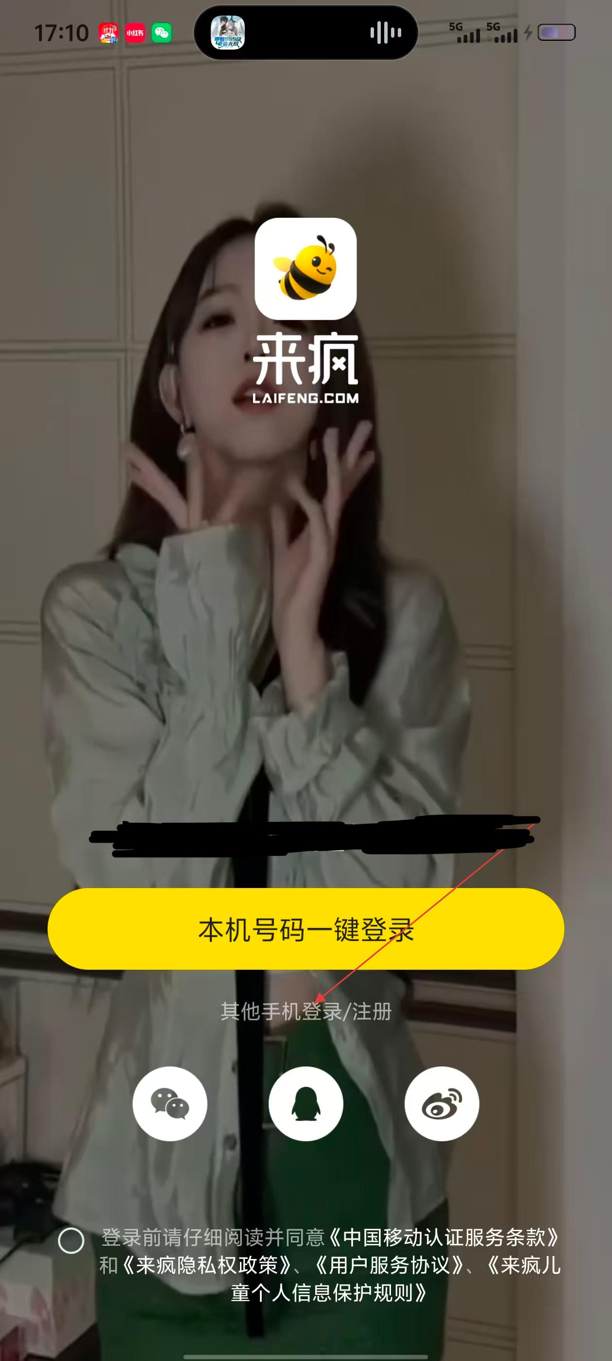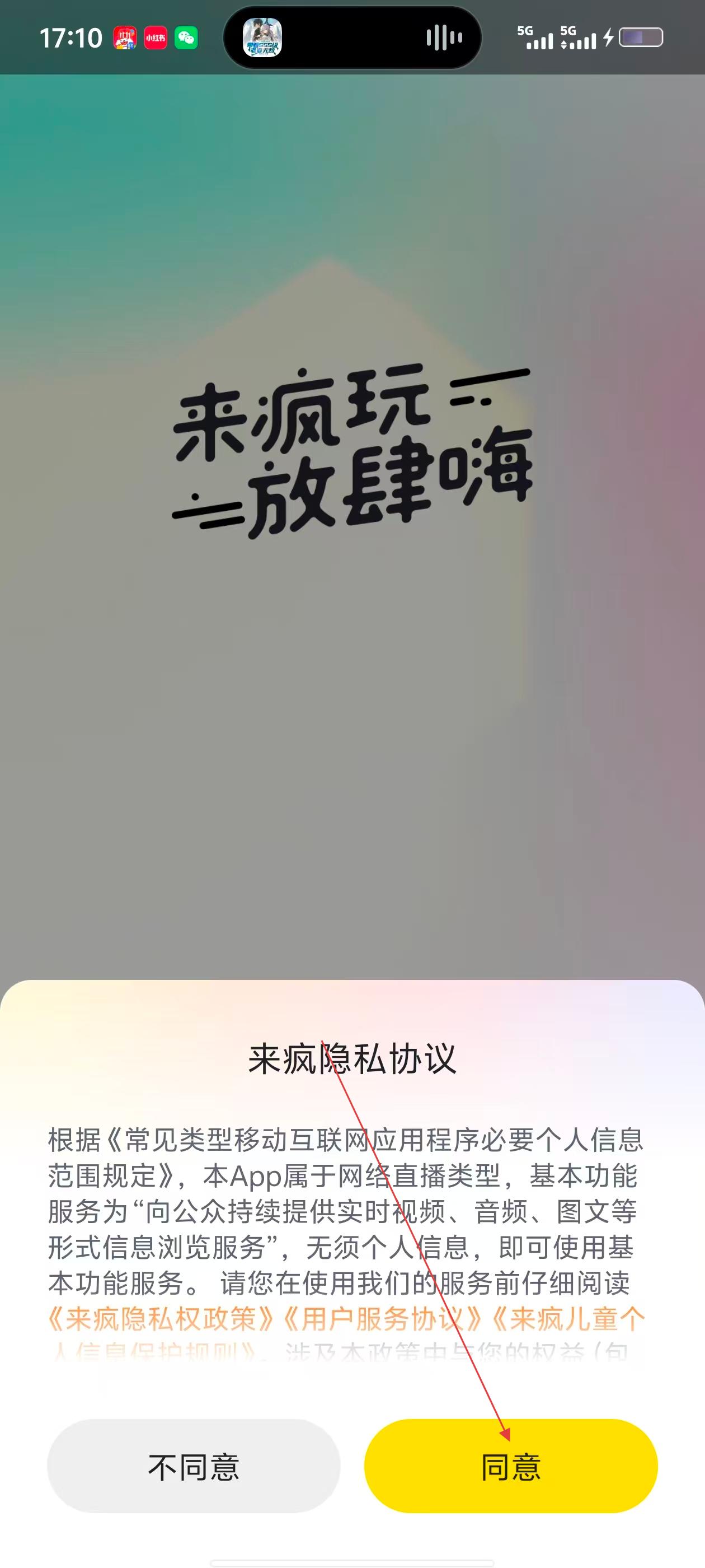 1、打开来疯直播后,会出现【来疯隐私协议】界面,阅读后点击【同意】,进入登录相关页面。