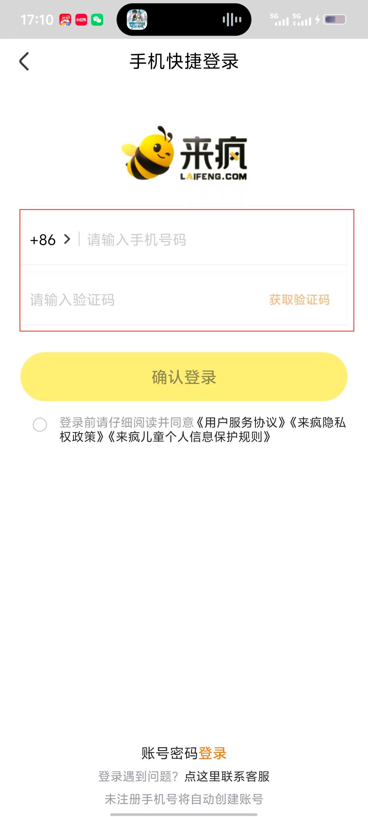 3、在手机快捷登录页面,输入手机号码,获取并输入验证码,准备登录。