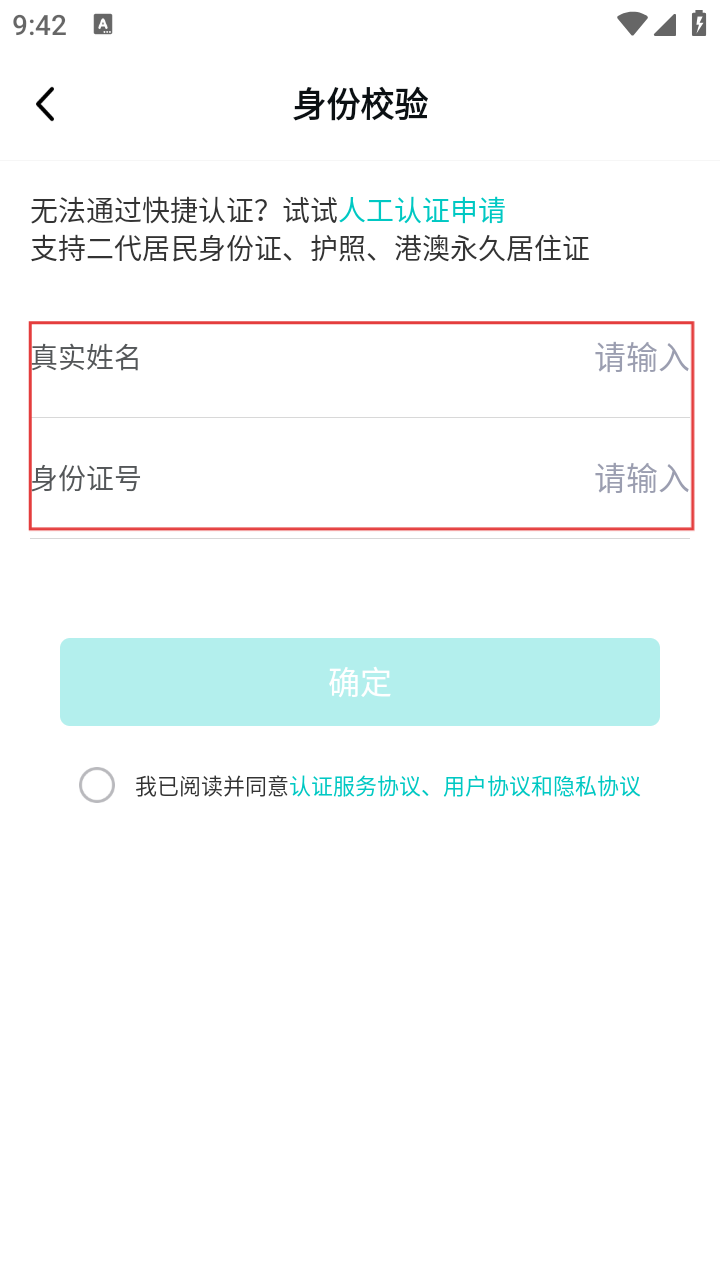 4、在身份校验页面,输入真实姓名和身份证号,勾选同意相关协议后,点击【确定】按钮,即可完成实名认证操作。