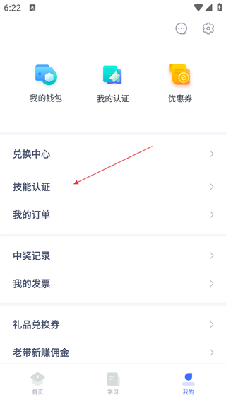 2、点击底部【我的】,进入个人中心,选择【技能认证】选项,进入技能证书界面。