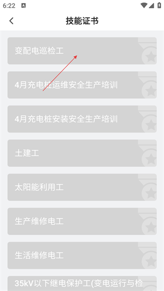 3、在技能证书页,选择目标证书(如变配电巡检工),触发考试确认提示。