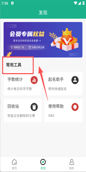 4、进入“发现”开启字数统计与起名助手,会员可去广告并解锁更多主题。