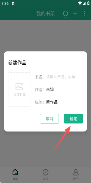 2、在“我的书架”点击“新建作品”,输入书名与作者即可创建小说项目。