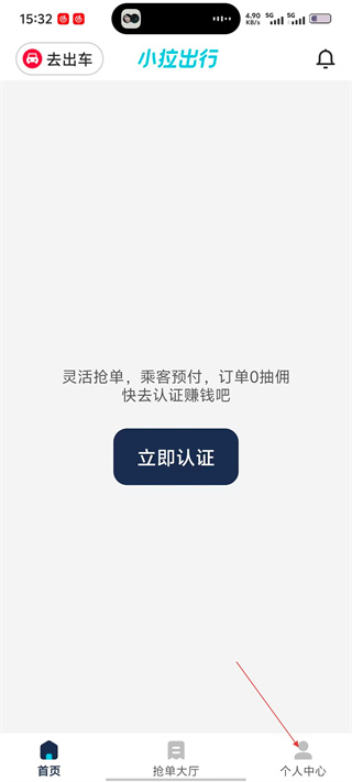 1、进入“小拉出行司机版”首页,点击底部【个人中心】进入个人页面。