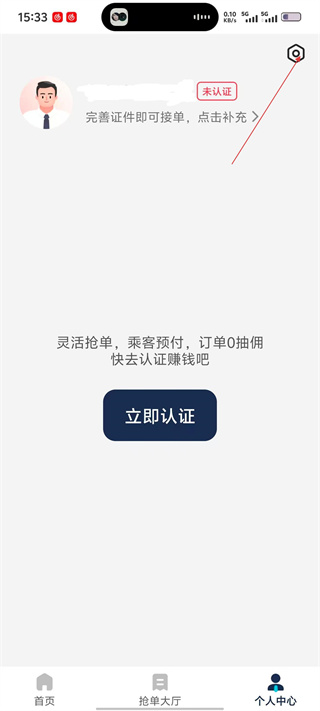 2、在个人中心页,选择右上角设置图标,进入设置界面。