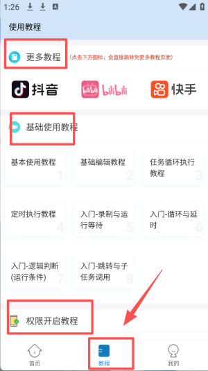 4、在教程页面,选择“更多教程”或“权限开启教程”进行学习。