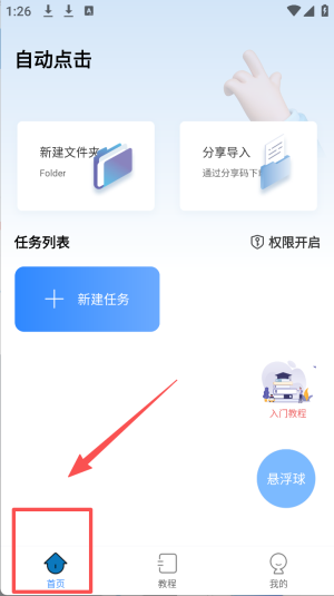 3、在自动点击主界面,点击“首页”图标,开始新建任务。