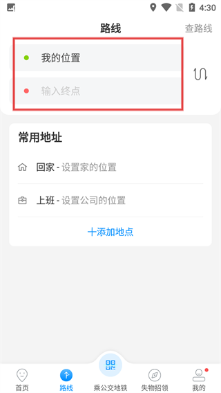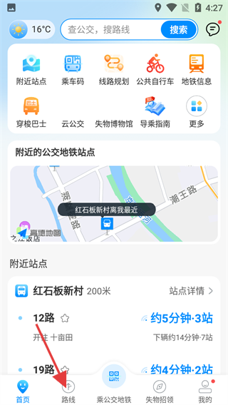 1、进入App首页,点击底部导航栏的【路线】选项,进入路线查询页面。