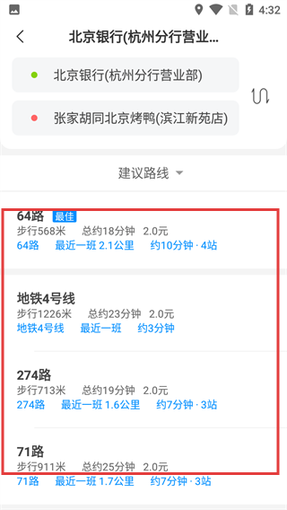 4、加载完成后,即可查看多种出行路线,包含步行距离、耗时、费用等信息,选择目标路线即可获取详细导航。
