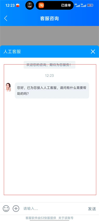 4、在客服对话页面,系统将自动接入人工客服,可在输入框中输入咨询内容,点击【发送】即可与客服沟通。