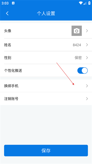 3、在个人设置页,选择【换绑手机】选项,进入验证手机页面。