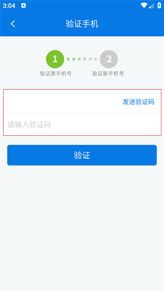 4、在验证原手机号环节,点击【发送验证码】,填写收到的验证码后点击【验证】,完成原手机号验证。