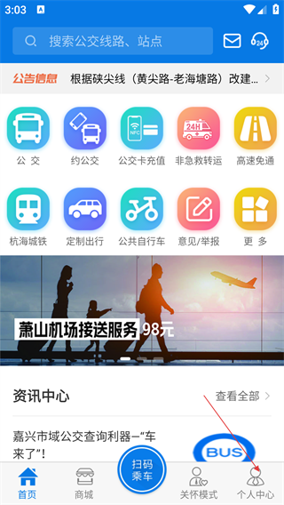 1、进入“海宁出行”App首页,可使用公交、约公交等出行服务功能。