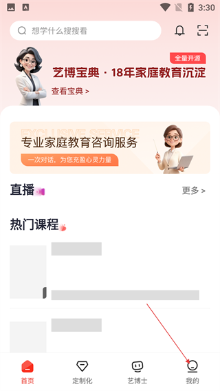 1、进入该家庭教育应用首页后,点击底部【我的】选项,可进入个人中心页面,查看账户相关功能入口。