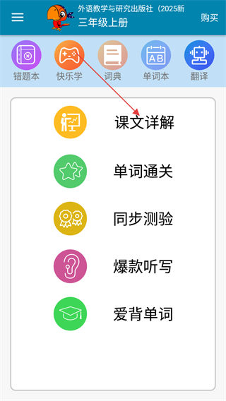 2、进入课本对应的功能页面后,点击【课文详解】选项,进入单元列表界面。