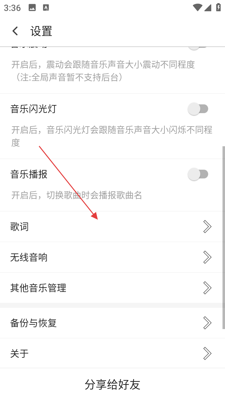 2、进入设置页面后,若要设置歌词相关选项,点击【歌词】选项。