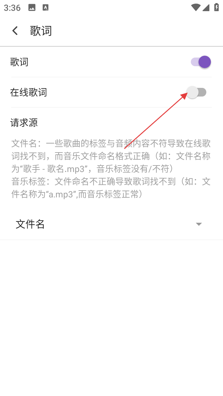 3、在歌词设置页面,若要开启在线歌词功能,点击【在线歌词】右侧的开关。