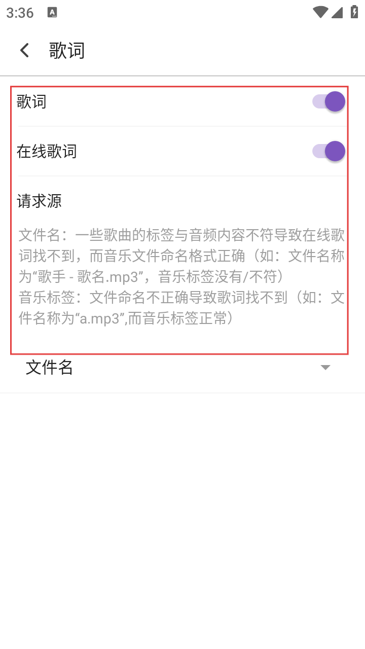 4、开启后,可看到【歌词】【在线歌词】等功能均已开启,还能查看请求源等相关说明。