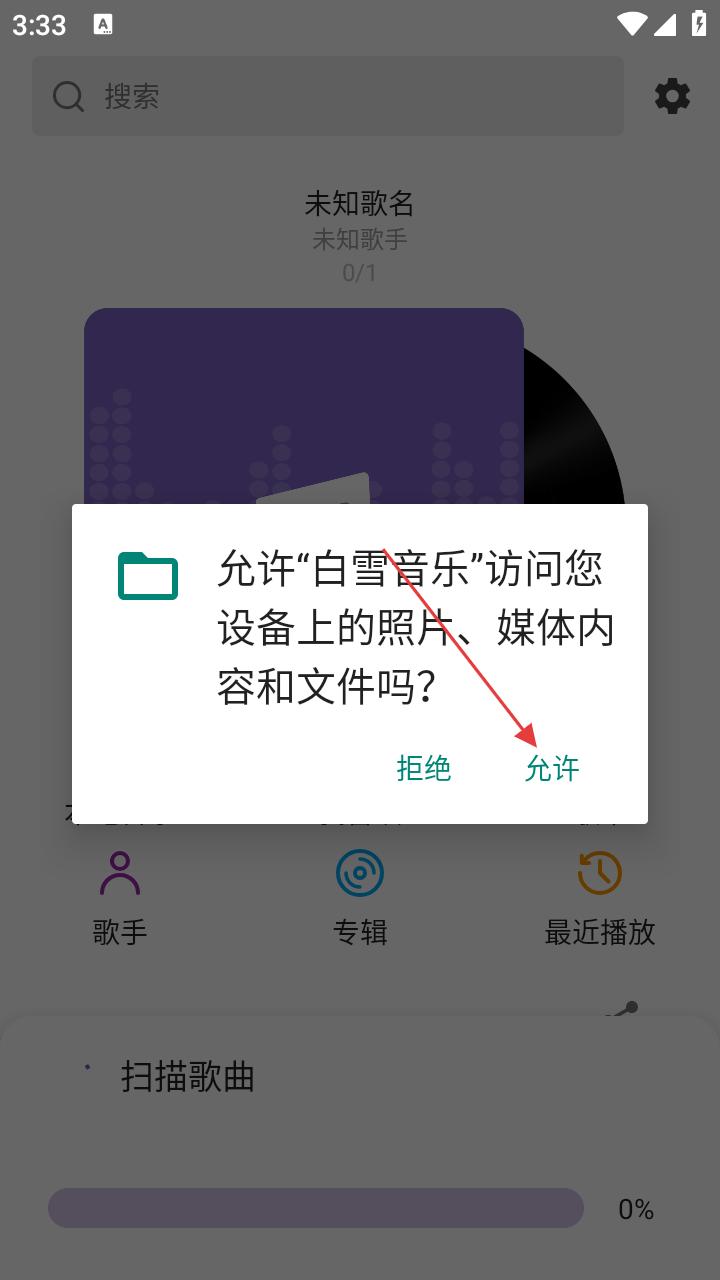 1、首次使用白雪音乐软件,若弹出权限请求框,点击【允许】,可让软件访问设备照片、媒体内容和文件。