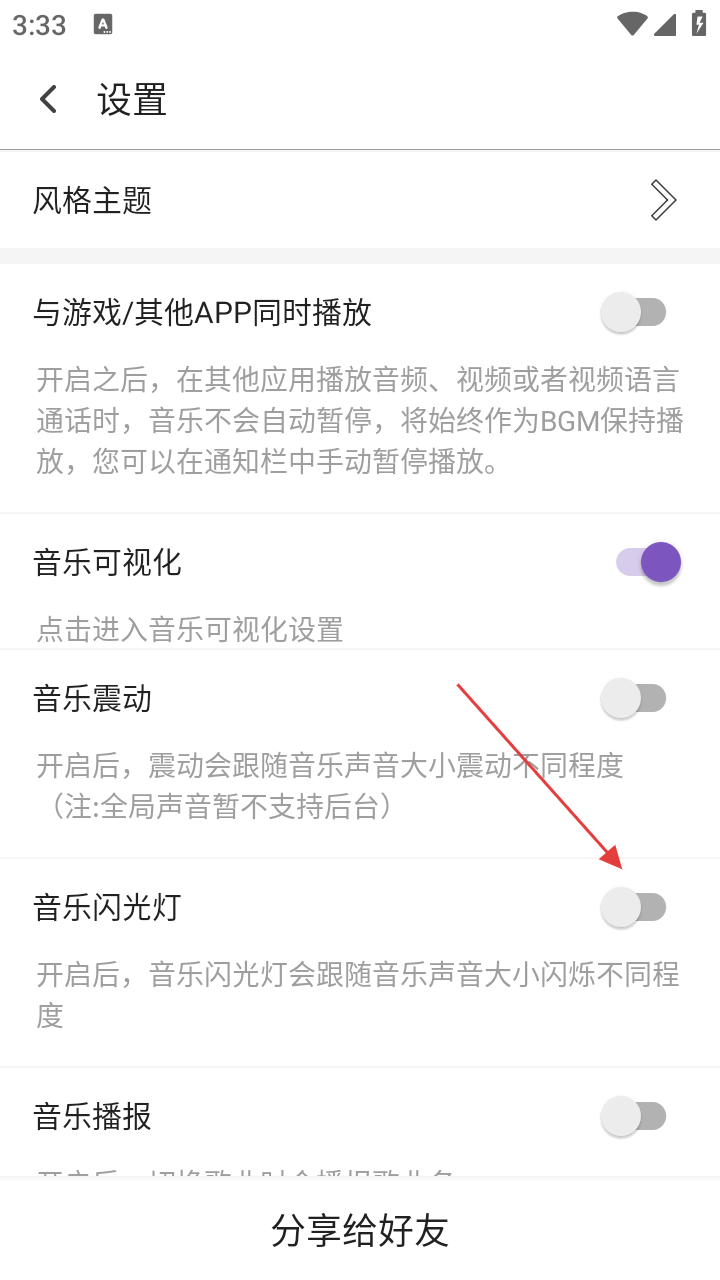 3、在设置页面,若要开启音乐闪光灯功能,找到【音乐闪光灯】选项,点击其右侧开关。